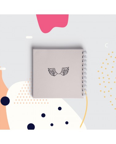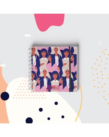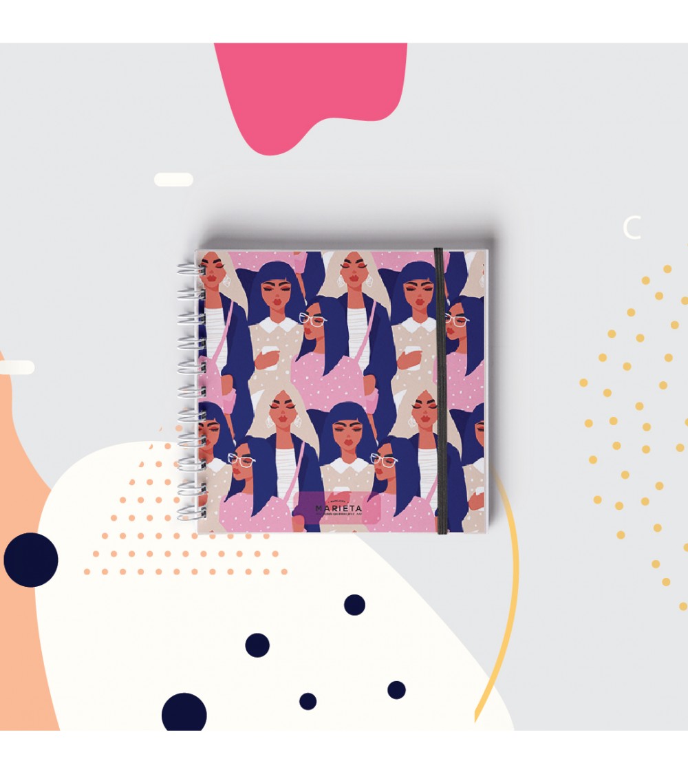 En su interior trae hojas con renglones y está encuadernada con rulo metálico blanco.
