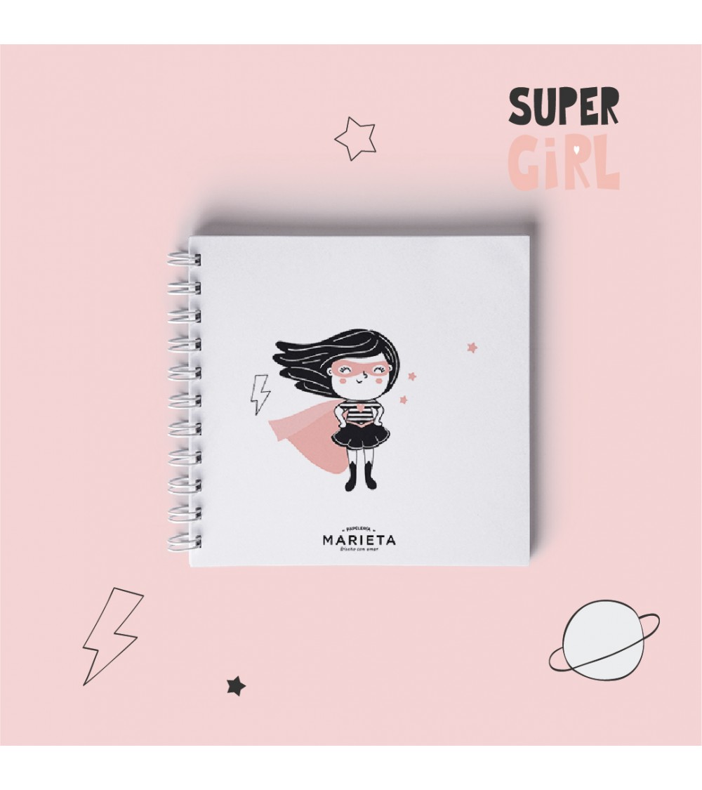 En su interior trae hojas con renglones y está encuadernada con rulo metálico blanco.
