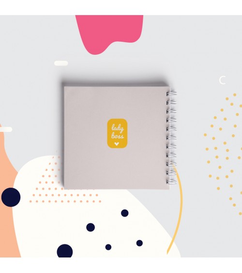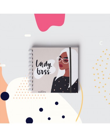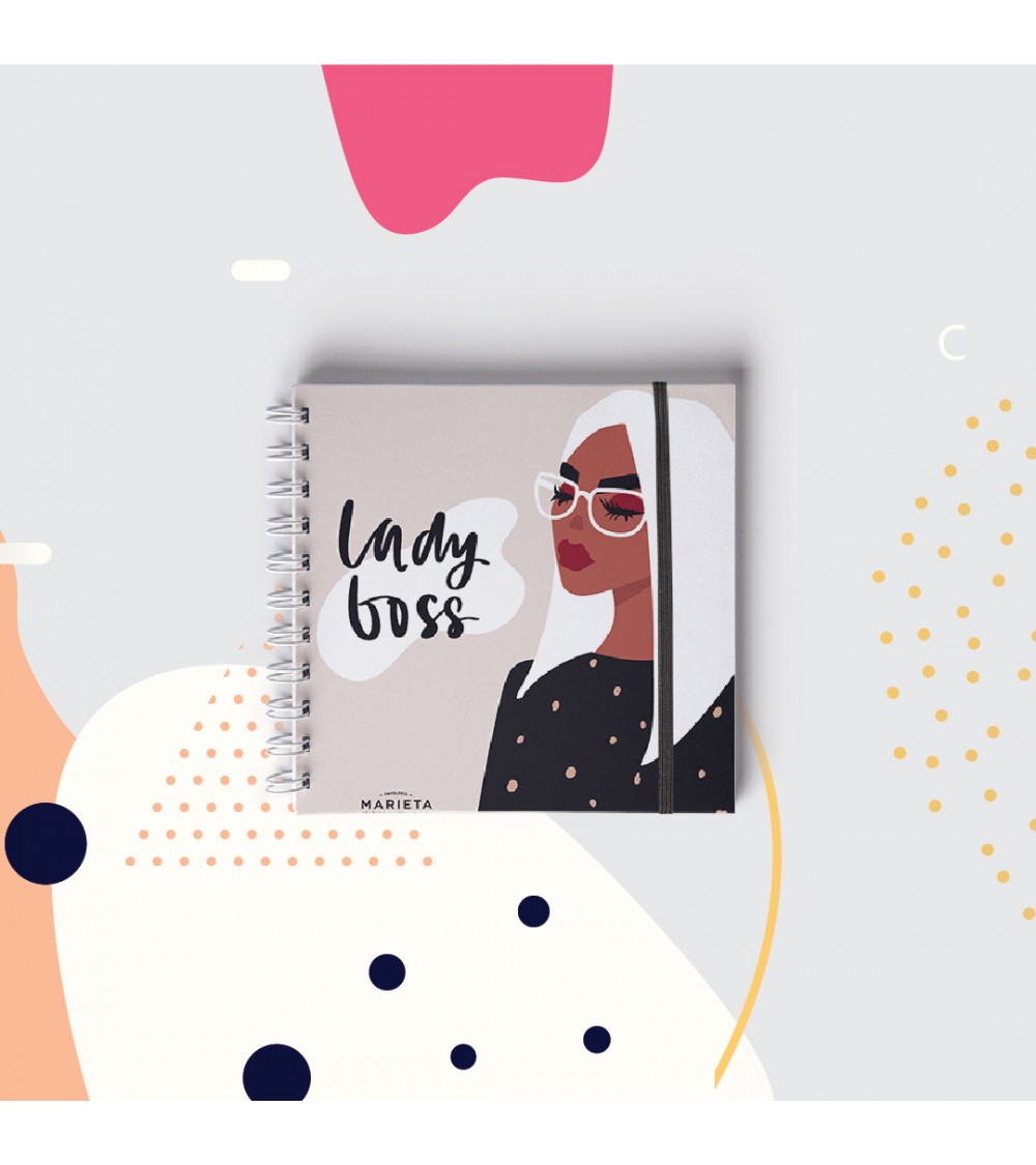 En su interior trae hojas con renglones y está encuadernada con rulo metálico blanco.